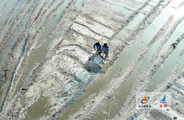 夏末,连云港市沿海盐田进入原盐收获期。8月18日,盐业工人利用当前晴好天气加紧扒盐作业,盐池中一派繁忙的收获景象。记者 王健民 通讯员 刘天义 摄